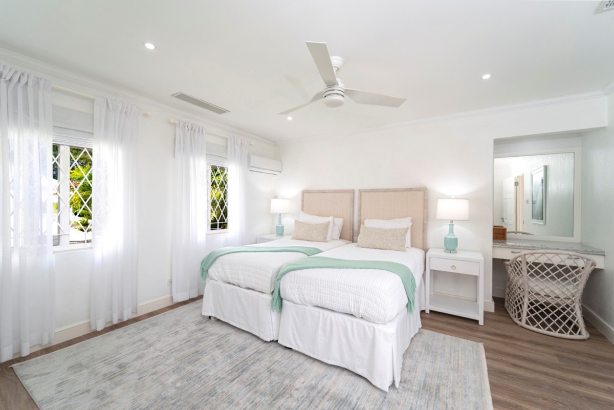 Bedroom 2: Bedroom with two single beds, A/C, ceiling fan, and en-suite bathroom with shower, vanity, and WC. 2 guests maximum.