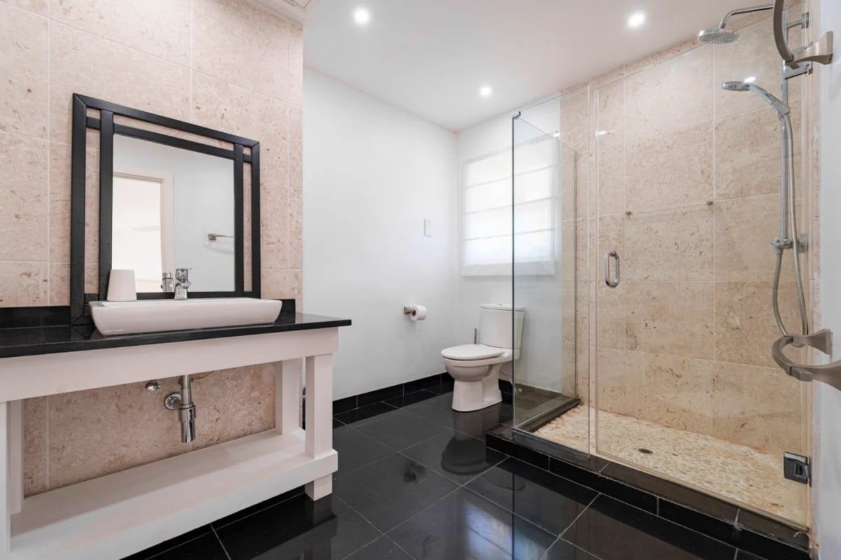 Upstairs, three beautifully appointed bedrooms each include en suite bathrooms and air-conditioning for comfort. The master suite overlooks the pool and includes a walk-in closet, adding a luxurious touch to your stay.
