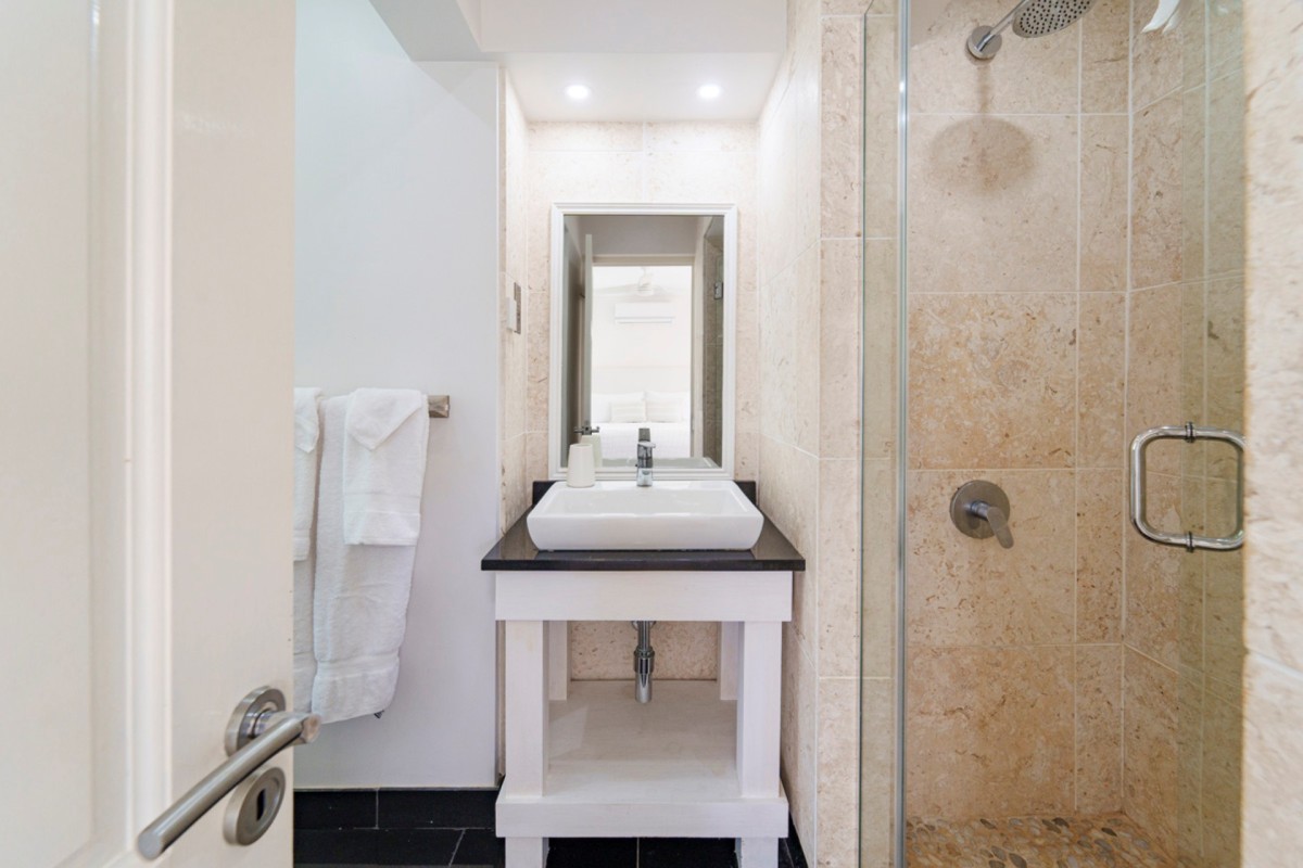 Bedroom 4: Bedroom with a queen-size bed, A/C, ceiling fan, and en-suite bathroom with shower, vanity, and WC. 2 guests maximum.