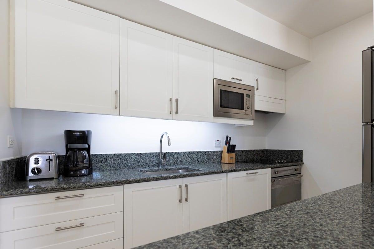 Both bedrooms are thoughtfully furnished to promote rest and privacy. The primary suite features an ensuite bathroom, while soft textures, clean lines, and a calming palette create a peaceful atmosphere throughout. After long beach days and island adventures, the condo feels like a sanctuary to return to.