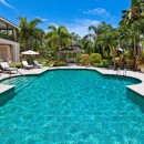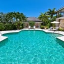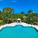 The design of the two-story villa is truly stunning and with upper and lower covered terraces, enormous and landscaped gardens and grounds, and a massive pool area, it really lives up to its name. A private paradise, the heart of it is that pool area. Surrounded by an elegant stone terrace, it offers up several sun decks and is flanked by an al fresco dining gazebo at one end and outdoor lounge and bar area at the other. It also opens into the lower level terrace, which itself is a luxurious outdoor living space.